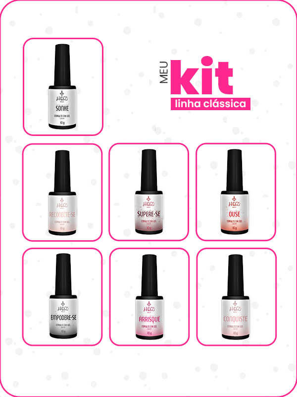 A coleção de esmaltes em gel HQZ Nails ‘A jornada dos sonhos’, linha clássica, especialmente criada para tornar suas criações ainda mais surpreendentes e duradouras! Com nossas 7 cores clássicas e inspiradoras – Sonhe, Reconecte-se, Empodere-se, Arrisque, Supere-se, Ouse e Conquiste – você terá um universo de possibilidades para oferecer às suas clientes.