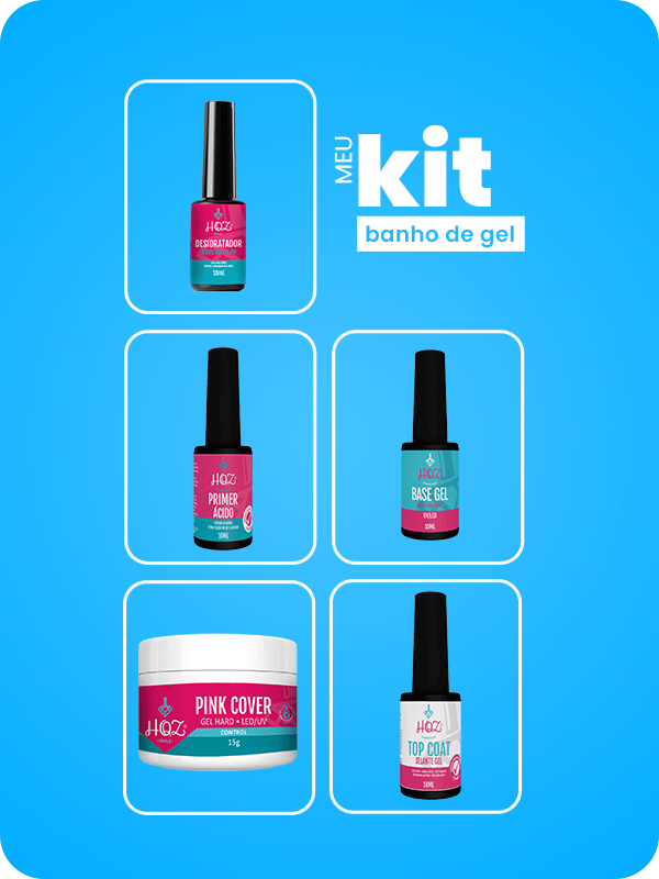 Kit com produtos HQZ Nails ideal para banho de gel em unhas naturais.